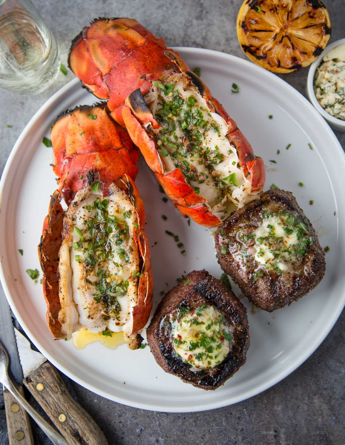 The idea is to coordinate and grill the food so the meat all comes off and ready at the same time. Because it’s ideal to let the beef rest 10 minutes before slicing, and to serve the lobster tails warm, coordinate by grilling the steak first, and then as it finishes and rests, to grill the tails.