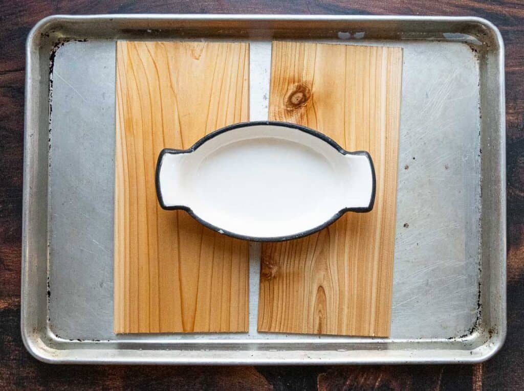 Note: Cedar planks want to float, so you may need to weigh them down with something heavy (see photo below). We like to use a large sheet pan, filled with water, then weigh them down with something heavy or weighted.