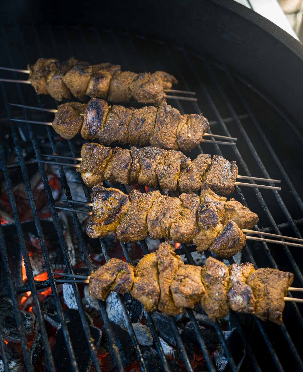1. Prep: Prepare your grill for direct grilling using lump charcoal. Target the internal temperature of the grill at 450 – 500 degrees Fahrenheit. Place the seasoned and cubed lamb steaks on skewers.