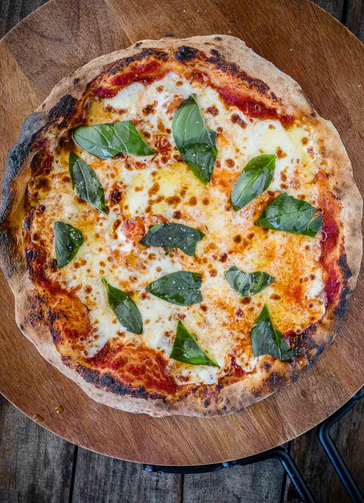 - Toppings – We add fresh basil for the classic flavor. Additional finishing flavors include good olive oil drizzle and a touch of finishing salt.