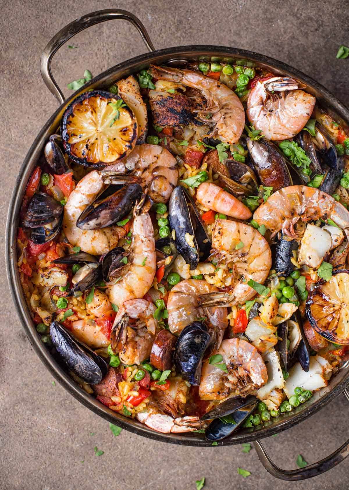 Traditional Paella is cooked in a steel shallow and wide pan. The metal is important for cooking over fire. When making this seafood paella recipe, consider at minimum a 12-inch wide, shallow, stainless steel pan. The steel, versus it’s cast-iron cousin, does not retain the heat as efficiently and helps to prevent burning when cooking on the grill.