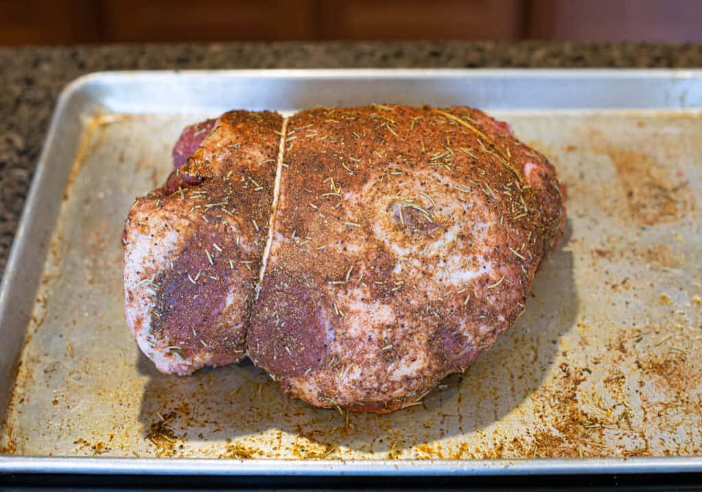 - Liberally apply the dry rub to the outer portion of the lamb, as well as the portion that surrounded the bone.