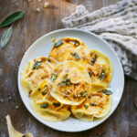 In a skillet, add butter over medium heat. Once it melts add the sage and cook until the sage begins to fry (about 3-4 minutes). Watch closely and don’t let the sage burn. If you start to see them turning brown, turn the heat off and take out the sage leaves. Remove from heat and place the sage pieces on a paper towel to dry and harden.
