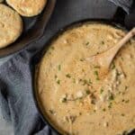 Add Milk: Pour the milk into the pan and bring to a slow simmer, stirring constantly. The simmering will help the roux activate and thicken the milk. Stir for 10 minutes or until the gravy is a thick and bubbly consistency. If you don’t stir often, the milk can scorch on the base of the pan giving an unpleasant flavor and texture.
